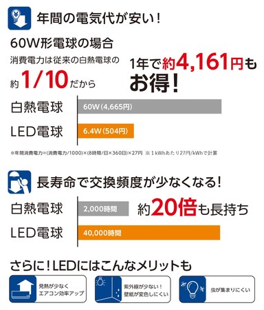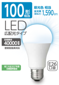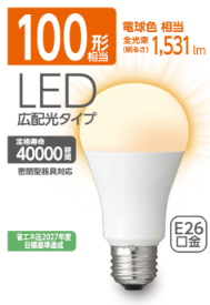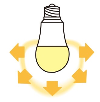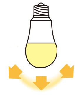 安価なLED電球は配光角度が狭いものが多い中、本製品は配光角度が約260度と広範囲のため、部屋全体に明るさが広がります。スタンドライトなど上向きの照明器具を使用する場合も足元まで明るく照らします。また、浴室灯や玄関の照明など、密閉型の照明器具にも対応しています。※100形相当を除く。