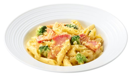 オリジナルのカルボナーラソースに、アクセントとして燻製ベーコンの香りと旨味を加え、後味を整えるブロッコリーを組み合わせた一品。休み時間などに軽く食べやすいよう、ショートパスタであるペンネを選びました。モッツァレラチーズ、パルメザンチーズ、チェダチーズなどを使用した、ペンネに絡むコク深いオリジナルソースに、最後の仕上げとしてたっぷりのパルメザンチーズをかけています。さらに、厚切りの燻製ベーコンは通常よりもしっかり燻製し、濃厚なソースにも負けない香りと旨味を引き出しました。