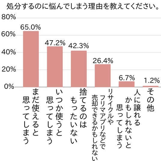 関東・全国ともランキング内容は同一で、第1位の「まだ使えると思ってしまう(関東65.0%・全国62.4%)」が最も多く、第2位「いつか使うと思ってしまう(関東47.2%・全国57.6%)」・第3位「捨てるのはもったいない(関東42.3%・全国50.6%)」がトップ3に並びました。
