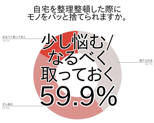今回のアンケートでは、自宅を整理整頓した際にモノをパッと捨てられない(少し悩む・なるべく取っておく)と答えた方は関東で約6割(59.9%)・全国で約7割(69.0%)でした。