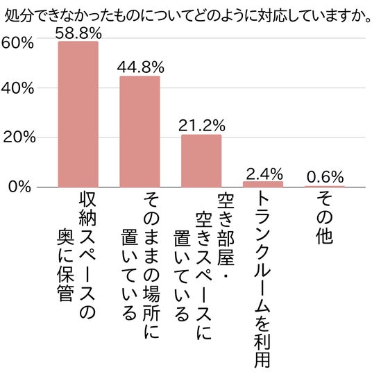 処分できなかったものの対応策として、収納スペースの奥・元々の保管場所・空きスペースなど、できるだけ生活の邪魔にならない場所を中心に保管していることがわかりました。しかし、邪魔にならない場所とはいえ、あまり使わないものが自宅のスペースをとっていることも事実です。