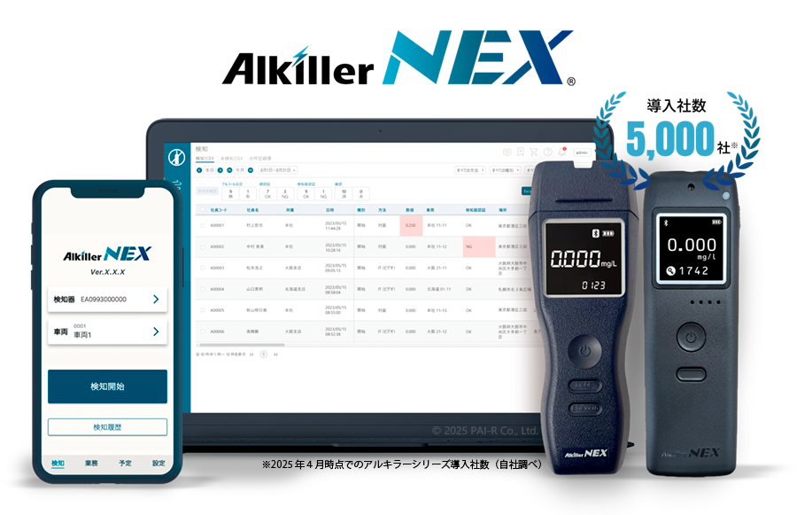 「アルキラーNEX」は、スマートフォンとアルコール検知器を連動させ、「いつ・どこで・誰が」アルコールチェックしたかを点呼記録と合わせてクラウドでデータ一元管理できるサービスです。