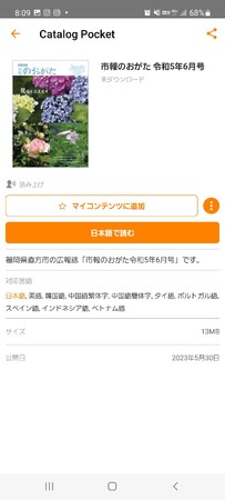直方市では、市民への情報発信を強化するため、多言語対応アプリ「カタログポケット」を導入しました。同アプリを使うことで、PDF形式の冊子やチラシを10言語<英語、韓国語、中国語(簡体字・繁体字)・タイ語、ポルトガル語、スペイン語、インドネシア語、ベトナム語、日本語>に翻訳および音声読み上げ(ベトナム語は未対応)できます。これにより市報をはじめとした市政情報を日本語が不得意な外国人に伝えることが可能となりました。