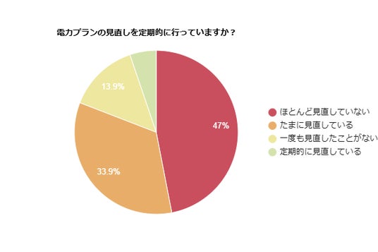 電力プランの見直しをしているかアンケートを実施したところ、「ほとんど見直していない」と回答した人が47%でした。「一度も見直したことがない」と回答した人も13.9%となっており、多くの人が見直しには消極的なことが分かりました。