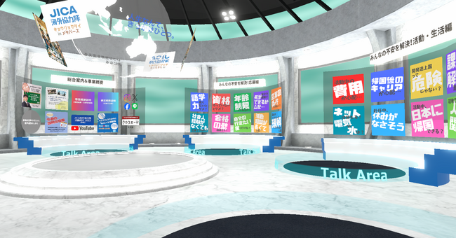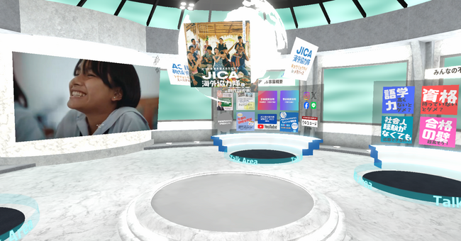 今回はVma plusの取組として初めて、JICA海外協力隊の活動についてを画像や動画で気軽に知ることのできるコンテンツと、オンライン説明会のストリーミング配信や、匿名性のあるアバターを操作しチャット機能を活用した個別相談などの人材募集に関するコンテンツを複合的に設置。