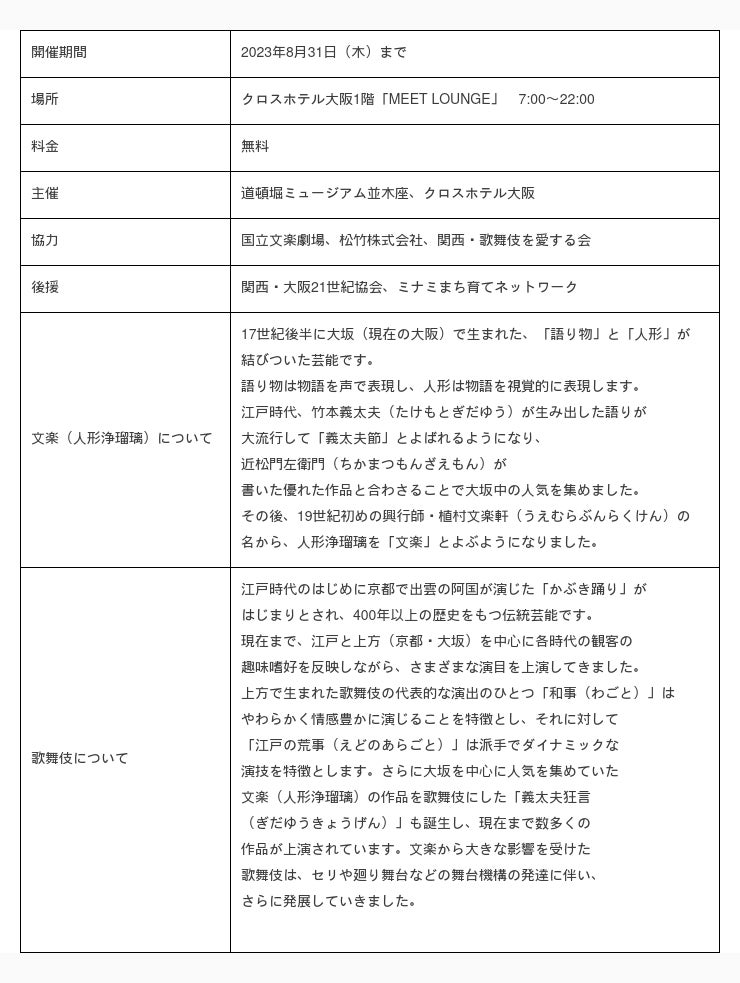 クロスホテル大阪(所在地:大阪市中央区、総支配人:若山 智)では道頓堀ミュージアム並木座と共同で、1階「MEET LOUNGE」において、2023年8月31日(木)までの期間、歌舞伎と文楽の歴史と世界感を体感できる展示企画「KABUKI×BUNRAKU in DOTONBORI by Dotonbori Museum NAMIKIZA」を開催します。