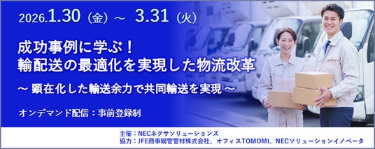 NECネクサソリューションズは、1月28日(水)限定で公開していました「成功事例に学ぶ!輸配送の最適化を実現した物流改革」セミナーの視聴期間を、ご好評につき3月31日(火)まで延長します。お申し込みは3月30日(月)まで受け付けています。
