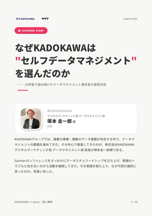 本資料では、複数の事業と複数のクラウドDWHが併存する複雑な環境下において、なぜKADOKAWA様が「タヅナ」が掲げる『セルフデータマネジメント』という思想を選んだのか、その選定プロセスと導入後のリアルな変化を紐解きます。