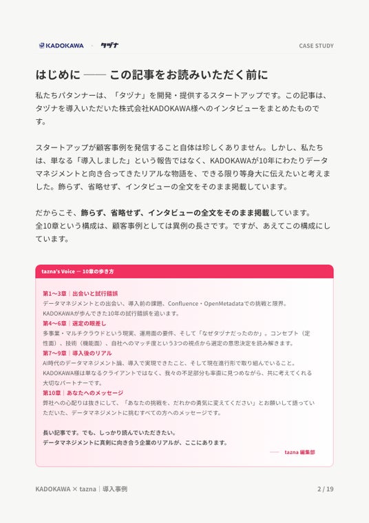 本記事では、単なる製品導入の成功譚ではなく、KADOKAWA様が10年間にわたりデータマネジメントと向き合ってきたリアルな物語を、飾らず、省略せずに全10章の構成でそのまま掲載しています。