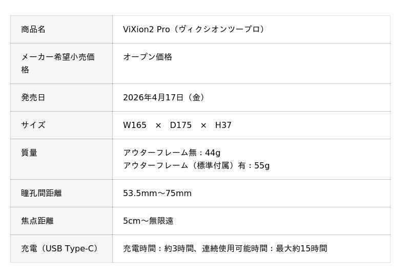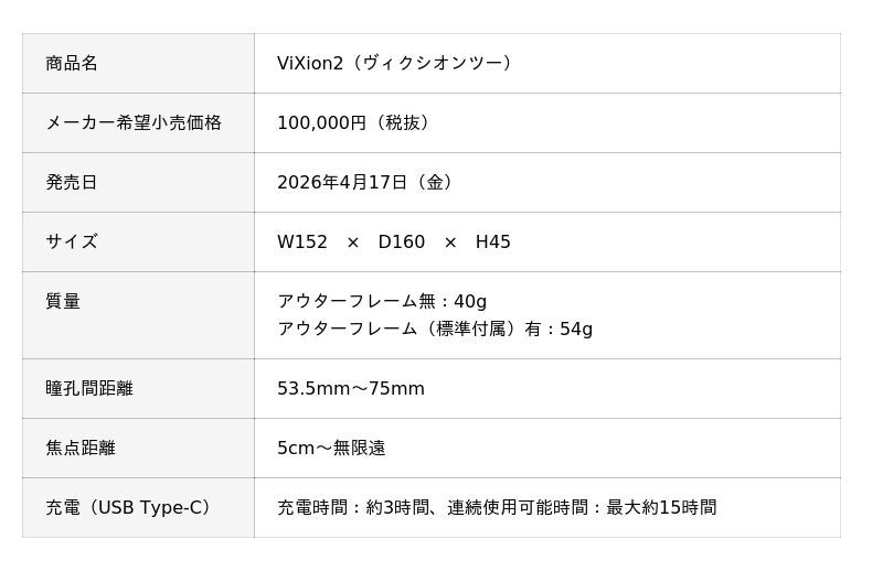 オートフォーカスアイウェア「ViXion」シリーズを開発・販売するViXion株式会社(本社:東京都中央区、代表取締役:南部誠一郎)は、視野面積を従来比で約2.4倍に拡大した新モデル『ViXion2(ヴィクシオンツー)』を2026年4月17日(金)に発売します。発売に先立ち、3月17日(火)より全国の取扱店および公式オンラインストアにて先行予約受付を開始いたします。