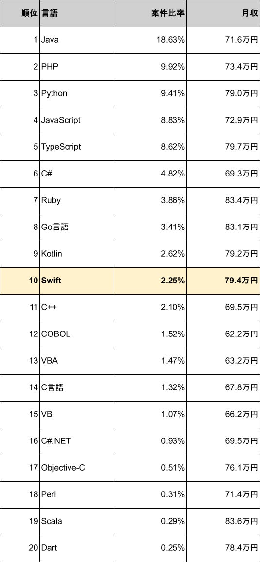 Swift案件の平均月額単価は79.4万円、平均年収は953万円で、プログラミング言語別の年収ランキングでは6位に位置しています。