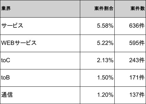 2026年4月時点のSwift案件は、サービスが5.58%(636件)で1位、WEBサービスが5.22%(595件)で2位、toCが2.13%(243件)で3位、toBが1.50%(171件)で4位、通信が1.20%(137件)で5位となり、上位5業界で全体の約15.63%を占めます。