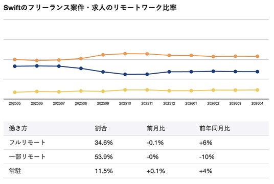 働き方ではフルリモート34.6%、一部リモート53.9%と在宅を含む案件が合計88.5%に達しており、個人作業との親和性が高いSwiftの開発特性からリモート環境との相性が良く、安定したリモートワーク比率を維持しています。