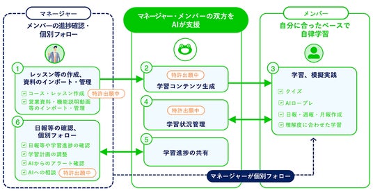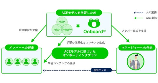 「Onboard AI」は、この課題を解決し、企業の人材育成に変革をもたらすサービスです。本サービスが実現するのは、独自に開発した育成フレームワーク「ACEモデル」に裏打ちされたメンバーの自律的な成長とマネジメントの進化です。生成AIが一人一人のスキルに合わせて最適な学習を届け、メンバーの成長を持続的に支援します。また、マネージャーは「教える」業務を生成AIに任せることで人間ならではの「育てる」対話に注力でき、一人一人に深く向き合いながらも、マネジメントできる人数を大幅に拡張できるようになります。