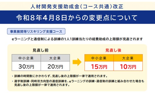 企業向けAI研修・コンサルティングを手掛けるホリエモンAI学校株式会社(本社:東京都新宿区、代表取締役社長:荒木 賢二郎、以下「ホリエモンAI学校」)は、令和8年4月8日に改定された「人材開発支援助成金(事業展開等リスキリング支援コース)」の改訂に関して、当社のお客さま、および今後ご検討の企業様への影響について公表いたします。