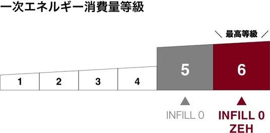 MUJI INFILL 0 ZEH水準商品では、断熱等性能等級は国の定めるZEH水準と同等の「等級5」、省エネ性能を示す一次エネルギー消費量等級は、最高の「等級6」となり、新築基準を超える断熱性能を実現します。