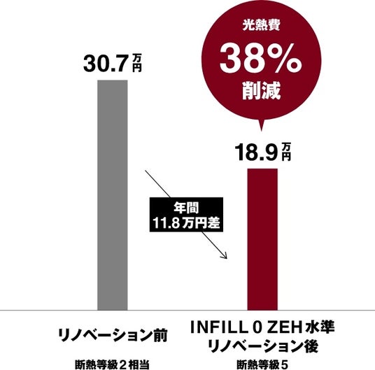 また、リノベーション前の物件として多い「旧省エネ基準」(断熱等性能等級2相当)のモデルプラン※3にてZEH水準リノベーションを実施することで光熱費を約38%削減の効果が見込まれます※4。これにより10年生活した場合、リノベーション前との差は約118万円となります。