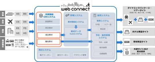 webコネクトは、必要な機能を必要な範囲で利用可能なSaaS型プロダクトです。商品のオンライン販売に求められる素材登録(造成)、検索、予約、電子クーポン、外部接続ゲートウェイといった機能群をモジュール化。国内・海外の多種多様な素材提供会社の素材をコネクトし、動的な商品登録(造成)・商品検索・商品流通・販売を、柔軟かつスピーディに実現します。