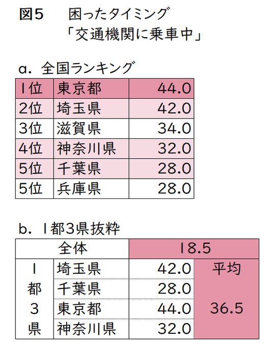 なお、突然の便意で困ったことのある人の最も多いシチュエーションは(図4)、「トイレが近くにない場所(外等)にいるとき(39.0%)」でした。2位から4位までの結果から(図4)、“移動時”に多いことがわかりました。特に、「電車などの交通機関に乗車中(18.5%)」を選択した人を都道府県別にみると(図5-a)、トップ5に「東京都」・「埼玉県」・「神奈川県」・「千葉県」の、1都3県がすべて含まれています。1都3県の平均は36.5%(図5-b)、で、全体平均の18.5%を大きく上回る結果となりました。