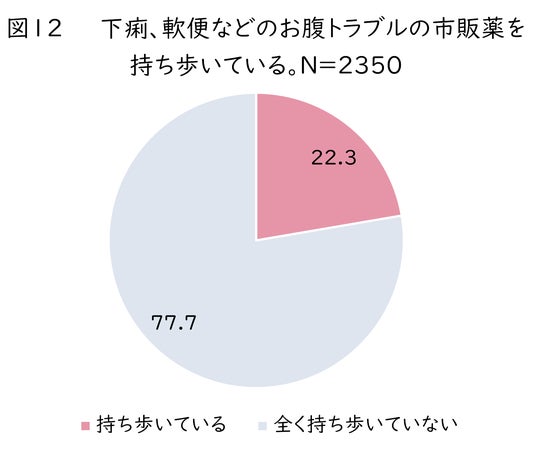 日ごろからお腹のトラブルに悩む人は全国で約6割。特に移動中に突然の便意に困る人が多くいたが、対処方法として「下痢止め」を持ち歩いている人は約2割にとどまった。