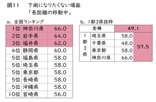 1位の「長距離の移動中」を都道府県別にみると(図11-a)、1位「神奈川県(66.0%)」、2位「岩手県(64.0%)」、3位「福井県(62.0%)でした。また、地域別では(図11-b)、突然の便意で困ったときに続き、1都3県が高い傾向となり、平均57.5%と、全国平均49.1%を上回りました。