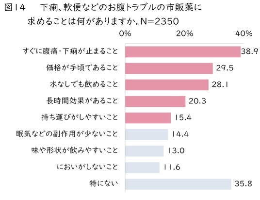 また、お腹のトラブルの市販薬に求めることについて質問をしたところ(図14)、1位「すぐに腹痛・下痢が止まること(38.9%)」、2位「価格が手頃であること(29.5%)」、3位「水なしでも飲めること(28.1%)」という結果になりました。その他、4位に「長時間効果があること(20.3%)」、5位に「持ち運びがしやすいこと(15.4%)」がランクインしており、症状に対して早く・長く効果があること、気軽に買える、手軽に飲める、持ち運びしやすい、ということが求められていることがわかりました。