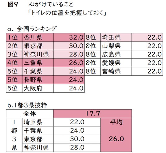 さらに、普段から心がけていることの中で、「トイレの位置を把握しておく」と回答した人の都道府県別トップ10を見ると(図9-a)、1位「香川県」、4位「三重県」、5位「長野県」など、通勤・通学時に公共交通機関を利用するであろう、都市部以外の地域も上位を占める結果となりました。一方、「東京都」・「神奈川県」・「千葉県」・「埼玉県」の1都3県も、すべてランクインしています。地域別だと(図9-b)、全体平均の17.7%に対し、1都3県は26.0%と、10%近く上回る結果となりました。