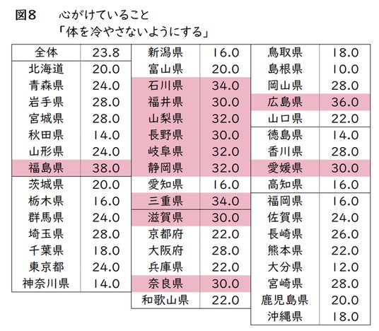また、普段から心がけていること1位の「体を冷やさないようにする」を都道府県別にみると(図8)、上位は中部・近畿地方に多く見られることが分かりました。反対に、北日本に位置する「北海道」や「青森県」・「秋田県」は、平均程度かそれ以下となり、「体を冷やさないようにする」意識は他県に比べそれほど高くないことが分かりました。この地域の人にとって「寒さ」は日常生活の一部であり、「体を冷やさないようにする」ことは、あえて心がけることでもないのかもしれません。このように、生活スタイルや住環境の違いによって、意識が異なることも推察できます。