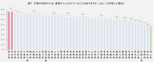 都道府県別にみると(図7)、普段から心がけていることが“ある”人が一番多かったのが同率(76.0%)で「埼玉県」・「奈良県」、一番少なかったのが「岡山県(44.0%)」と、一位と最下位で30%以上の差がありました。突然の便意で困った経験の割合に差があるのと同様に、普段から心がける意識も、都道府県によって大きな差があることが明らかになりました。