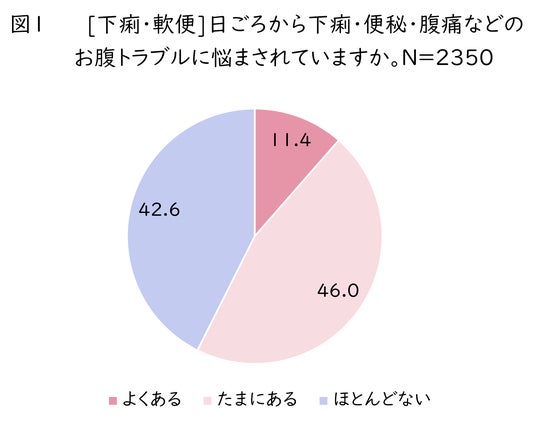 悩む人は全国で約6割。 日ごろからお腹のトラブル(下痢・軟便)に悩まされていますか、という質問に対し(図1)、「よくある(11.4%)」、「たまにある(46.0%)」と、合わせて57.4%の人が“ある”と回答しました。