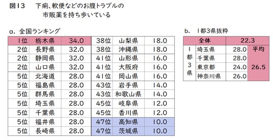 また、1都3県は、突然の便意に困ったことのある人が多く、特に交通機関の乗車中に不便を感じているため、「下痢止め」を持ち歩く人の割合も高かった。ただ、高いと言っても3割を超えておらず、下痢に困る人は多くいるにも関わらず、「下痢止め」を持ち歩くという対処方法は、まだまだ浸透していないことがわかった。