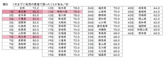 都道府県別にみると(図3)、同率が多い中、1位は単独で「東京都」という結果でした。また、地域別にみると、首都圏1都3県の平均は81.5%と、平均より10%近く高く、「東京都」、「千葉県」、「埼玉県」、「神奈川県」の1都3県は、他の地域よりも突然の便意に困ったことが“ある”人が多い傾向があるとわかりました。また反対に、1番困った経験が少ないといえるのは、「和歌山県」、「熊本県」でした。