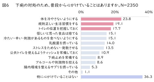 下痢の対処のために普段から心がけていることについて質問したところ(図6)、「特に心掛けていることはない」と回答した人は36.6%でした。つまり、その他6割以上は“普段から心がけている”ということがわかりました。実際に心がけている内容としては、1位「体を冷やさないようにする(23.8%)」、2位「規則正しい生活習慣をする(19.1%)」、3位「トイレの位置を把握しておく(17.7%)」という結果となりました。他、一風変わった回答としては、「素数を数える」「片栗粉を水に溶いて飲む」という独自の方法を取る人もいました。日ごろからお腹のトラブルに悩む人は約6割、突然の便意で困ったことがある人は7割以上いるにも関わらず、対処方法として、即効性のある対策はあまり取られていないことがわかりました。