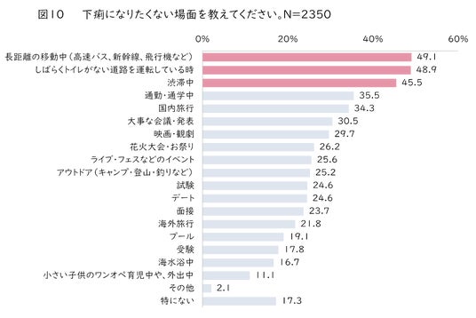 下痢になりたくない場面について質問したところ(図10)、1位「長距離の移動中(高速バス、新幹線、飛行機など)(49.1%)」、2位「しばらくトイレがない道路を運転している時(48.9%)」、3位「渋滞中(45.4%)」と、突然の便意で困ったとき同様、“移動時”が多い結果となりました。