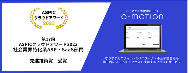 安全なオンライン取引・ネット通販のインフラづくりに貢献するかっこ株式会社(本社:東京都港区、代表取締役社長CEO : 岩井 裕之、証券コード:4166、 以下、かっこ)が提供する不正アクセス検知サービス「O-MOTION(オーモーション)」がこの度、「第17回ASPICクラウドアワード2023」(旧:ASPIC IoT・AI・クラウドアワード)において、社会業界特化系ASP・SaaS部門の先進技術賞を受賞いたしました。