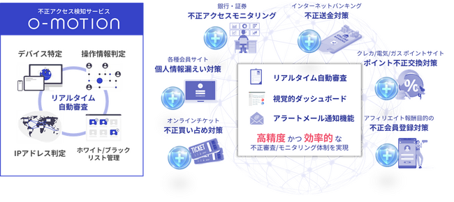 「O-MOTION」は、特許を取得した独自の端末特定技術とキータッチなどの操作情報の活用により、正しいID・パスワードによるアクセスであっても、そのアクセスが本当に本人によるものであるのか、不正者による不正アクセスなのかをリアルタイムに検知するクラウドサービスです。自動プログラム(Bot)による総当たり攻撃や他人のID・パスワードを使った不正者のなりすましを検知し、通販サイト、金融サービスサイト(インターネットバンキング・ネット証券)、会員サイト等において、不正アクセス/不正ログイン対策にご利用いただいております。