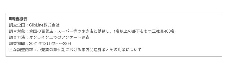 多店舗展開ビジネスの組織実行力を高める動画マネジメントシステム「ClipLine(クリップライン)」を提供するClipLine株式会社(本社:東京都品川区、代表取締役社長:高橋 勇人、以下「当社」)は、小売業を対象にした「繁忙期施策と対策に関する調査」を実施しましたのでその結果を発表します。