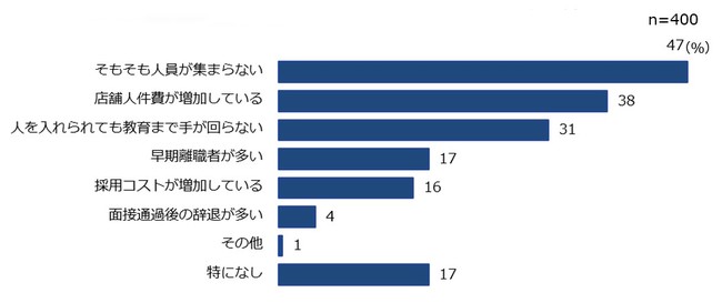募集をかけても集まらないという回答がトップとなり、アルバイトやパートを中心とする非正規雇用者が主力となる小売業において、コロナ禍以前の人手不足だった状況が再来している様子がうかがえます。さらに時給が高騰しているため、店舗人件費を気にする声も多く、人員増はハードルの高い解決策となっていることがわかります。また、人員を増やしても教育ができないという回答が31%ありました。