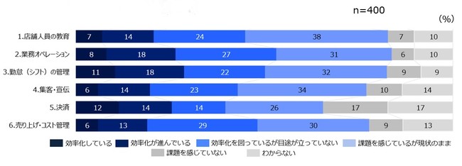 効率化については、業務オペレーションと勤怠管理の2点が「効率化している」あるいは「効率化が進んでいる」という回答の割合が多くなりました。全般的に「効率化を図っているが目途が立たない」「課題はあるが現状のまま」というネガティブな回答の割合がもっとも多く、店舗人員の教育については最多の62%がうまく対応できていないという回答でした。