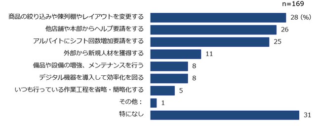 「特になし」という回答が最も多く、対策を行う場合は、「商品の絞り込みやレイアウトの変更」がトップとなり、売れ筋の商品をうまく訴求することが売上向上だけでなく運営効率化につながると考えられているようです。その他、人員補充に関する回答が上位に並びましたが、外部から獲得するのではなく他店舗からの応援や、既存の人材に勤務回数を増やすよう働きかけるという回答が多数を占めました。