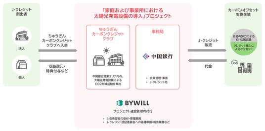株式会社バイウィル(本社:東京都中央区、代表取締役CEO:下村 雄一郎、以下「バイウィル」)は、株式会社中国銀行(本店:岡山県岡山市、取締役頭取:加藤 貞則、以下「中国銀行」)が運営管理者を務めるJ-クレジット創出プロジェクト、「ちゅうぎんカーボンクレジットクラブ」の運営管理業務を受託・代行し、取り組みを進めていくことをお知らせします。これは、2023年11月16日(木)に実施された第57回 J-クレジット(*1)制度認証委員会にて登録が認められた、家庭・事業所における太陽光発電設備の導入によるJ-クレジットの創出プロジェクトです。