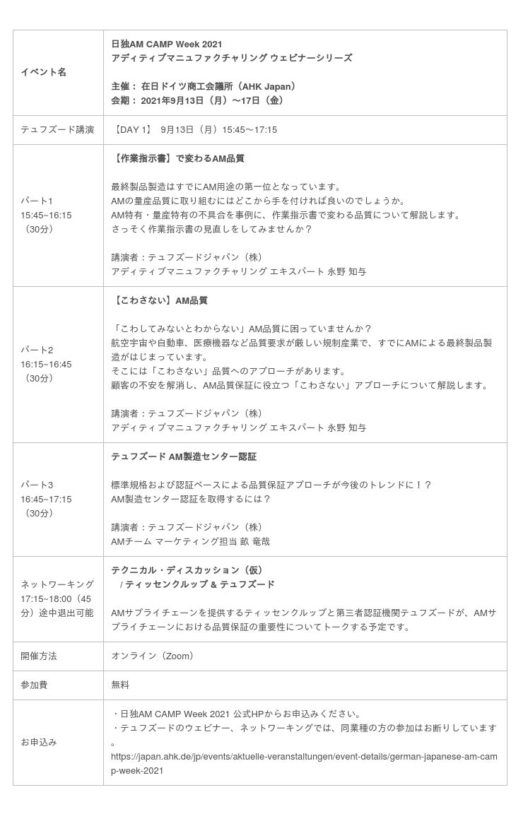 国際的な第三者認証機関であるテュフズードの日本法人テュフズードジャパン株式会社(本社:東京都新宿区、代表取締役社長:ディーター・エッカート)は、2021年9月13日(月)、在日ドイツ商工会議所主催のウェビナーシリーズ「日独AM CAMP Week 2021」にて、積層造形/3Dプリンティングの品質保証の仕組みづくりについて3つのテーマで解説します。また、同日に独ティッセンクルップ社とのディスカッションも予定しています。