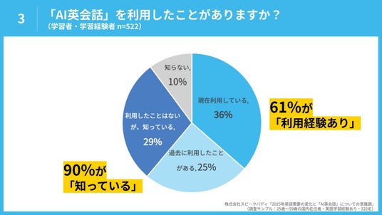 3.英会話学習経験者(現在学習中または以前に学習していたことがある方)のうち、61%が「AI英会話」の利用経験がある。また「利用したことはないが知っている」方を含めるとその認知度は9割に達しており、利用・認知ともに広がっていることが伺える。