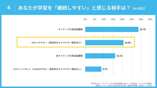 こちらに関連し、今回の調査では「学習を『継続しやすい』と感じる相手は?」と聞いたところ、「ネイティブの英会話講師(28.7%)」に次いで「AIキャラクター(具体的なキャラクター設定あり)(20.6%)」が上位となった。