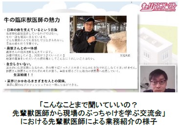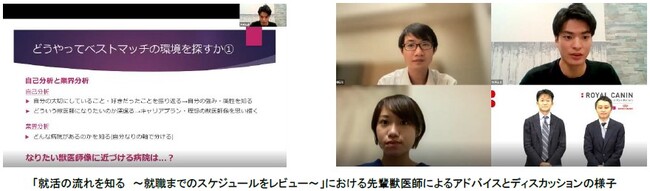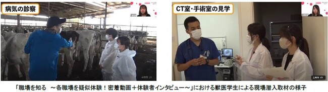 また7月に開催した「職域を知る ~獣医師の活躍分野 動物病院・公務員・企業など~」では、ロイヤルカナンの氏家貴秀と尾身衛祐から、多岐にわたる獣医師の幅広い職域での活動について紹介したほか、9月の「職場を知る ~各職場を疑似体験!密着動画+体験者インタビュー~」では、5名の獣医学生が実際に獣医療の現場へ潜入取材を行い、小動物臨床、大動物臨床、研究職のそれぞれの職場で働く実体験をレポートしました。