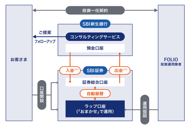 SBI新生銀行とSBI証券は、2022年8月9日(火)より金融商品仲介業務での提携を開始し、2022年10月20日(木)から投資一任サービス「SBIラップ×SBI新生銀行」を提供してまいりました。「SBIラップ×SBI新生銀行」は、お客さまのリスク許容度合いに応じて5つの運用スタイルから最適なポートフォリオを選択できるサービスです。FOLIOが提供する「4RAP」という投資一任プラットフォームの特性を活かし、SBI証券の金融商品仲介口座を通じてお客さまにサービス提供しています。