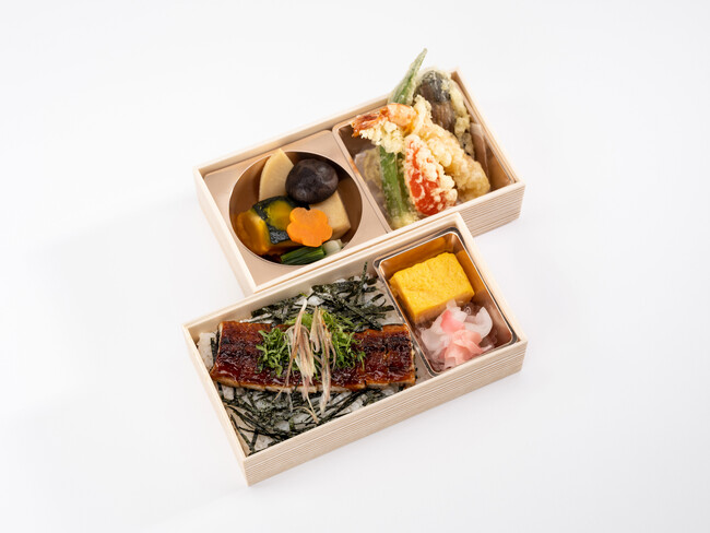 「うなぎの蒲焼針海苔重御膳(季節の天婦羅添え)」うなぎの香りを損なわないように、蔦金が針海苔のカットサイズにこだわった、老舗の本気のコラボレーションを是非、お試しください。