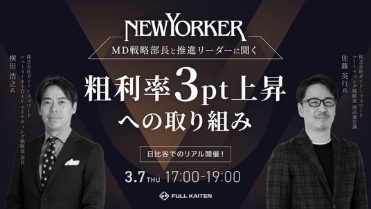 既存在庫での売上・粗利・キャッシュフローの最大化を支援する在庫分析クラウド『FULL KAITEN』を展開するフルカイテン株式会社(本社・大阪市福島区、代表取締役・瀬川直寛)は、2024年3月7日(木)に「NEWYORKER(ニューヨーカー)」などのアパレルブランドの小売や製造卸売を手がける株式会社ダイドーフォワード様が登壇するオフラインセミナーを開催します。本イベントでは、在庫課題に取り組む同社マーケティング戦略部・部長の横田氏と推進リーダーとして実務を担当された佐藤氏に登壇いただき、粗利率が全体で3ptも上昇した取り組みや社内をどのように改革したかも解説頂きます。イベント後半には、交流会も予定しております。