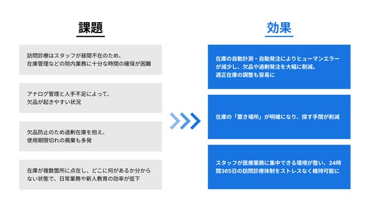あおばリガーレクリニックは、通院が困難な患者の自宅に訪問し、24時間365日対応の診療を提供しています。しかし、訪問診療の性質上、スタッフが昼間不在のため、在庫管理などの院内業務に十分な時間を確保することが困難でした。さらに、医療物品の管理は手作業に依存しており、在庫の欠品や過剰在庫、使用期限切れの廃棄が課題となっていました。また、在庫が複数の場所に点在し、必要な物品を探す手間も大きな負担となっていました。
