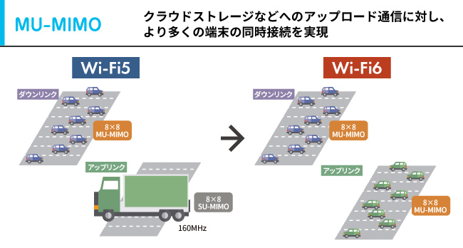 MU-MIMO (Multi User Multiple Input Multiple Output) は、複数の端末に同時にデータを送受信する技術です。Wi-Fi5ではダウンロード方向のみだったのに対し、Wi-Fi6ではアップロード方向でも利用可能に。これにより、クラウドストレージなどアップロードが多いアプリの通信がより快適になりました。